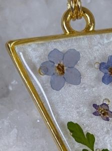 Collier pendentif en fleurs de myosotis séchées et résine – Pièce unique